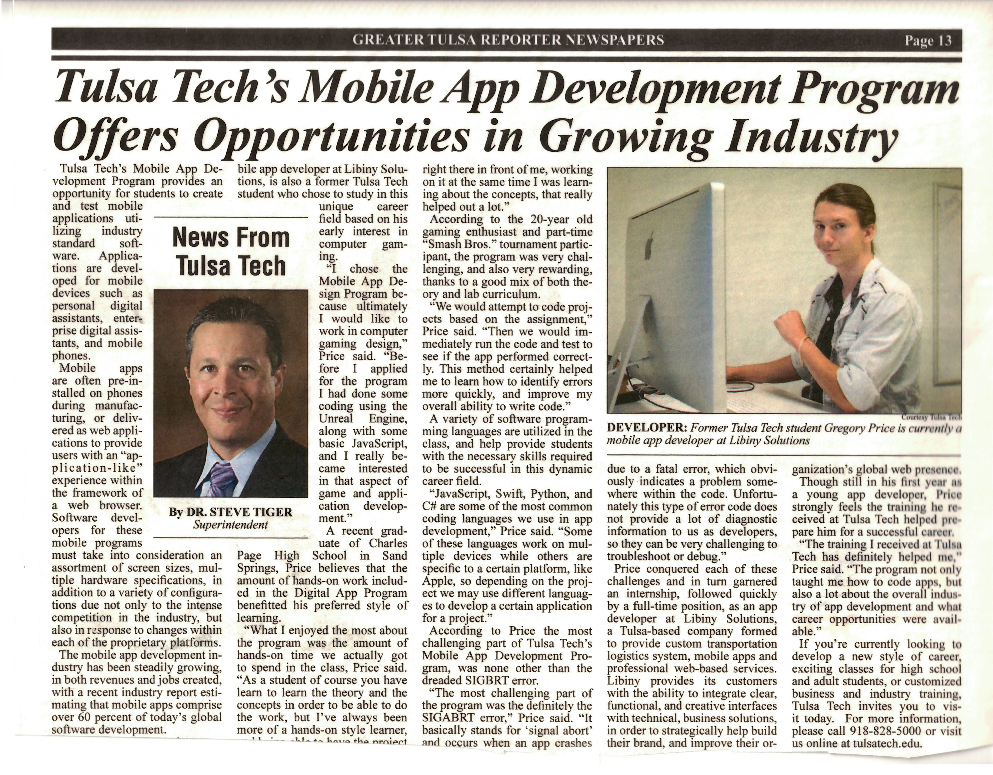 “The training I received at Tulsa Tech has definitely helped me,” Price said. “The program not only taught me how to code apps, but also a lot about the overall industry of app development and what career opportunities were available.”